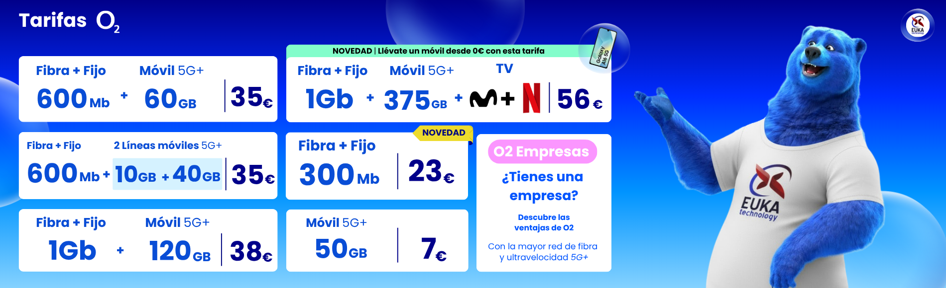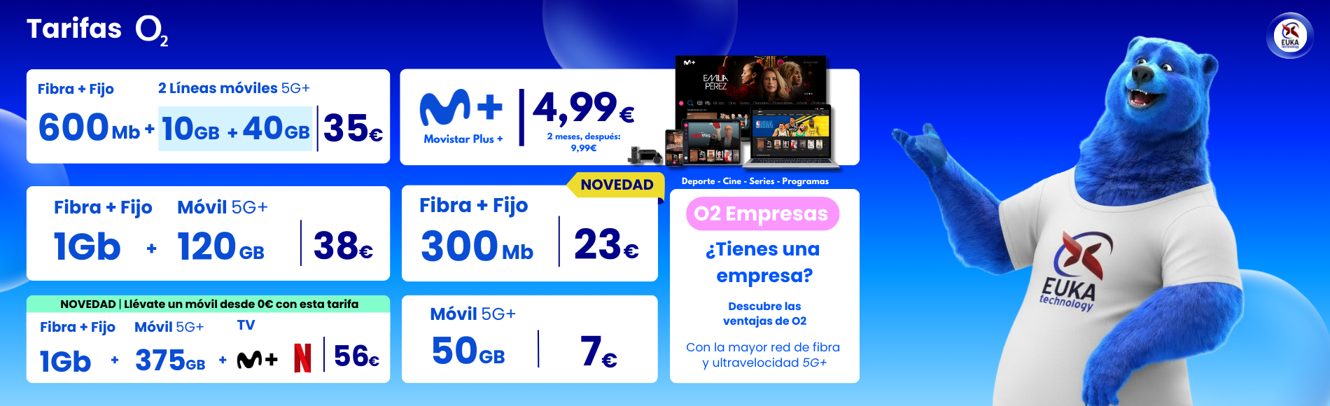 Las ofertas de fibra y móvil de O2 te ofrecen la mejor conexión en casa porque contamos con la mayor red de fibra óptica España, la de Telefónica. Con nuestra fibra podrás trabajar desde casa, ver series o películas sin cortes y jugar online sin interrupciones. Al contratar una tarifa de fibra y móvil, también contarás con la mejor conexión fuera de casa gracias a la calidad de la tecnología 5G+ de Telefónica.